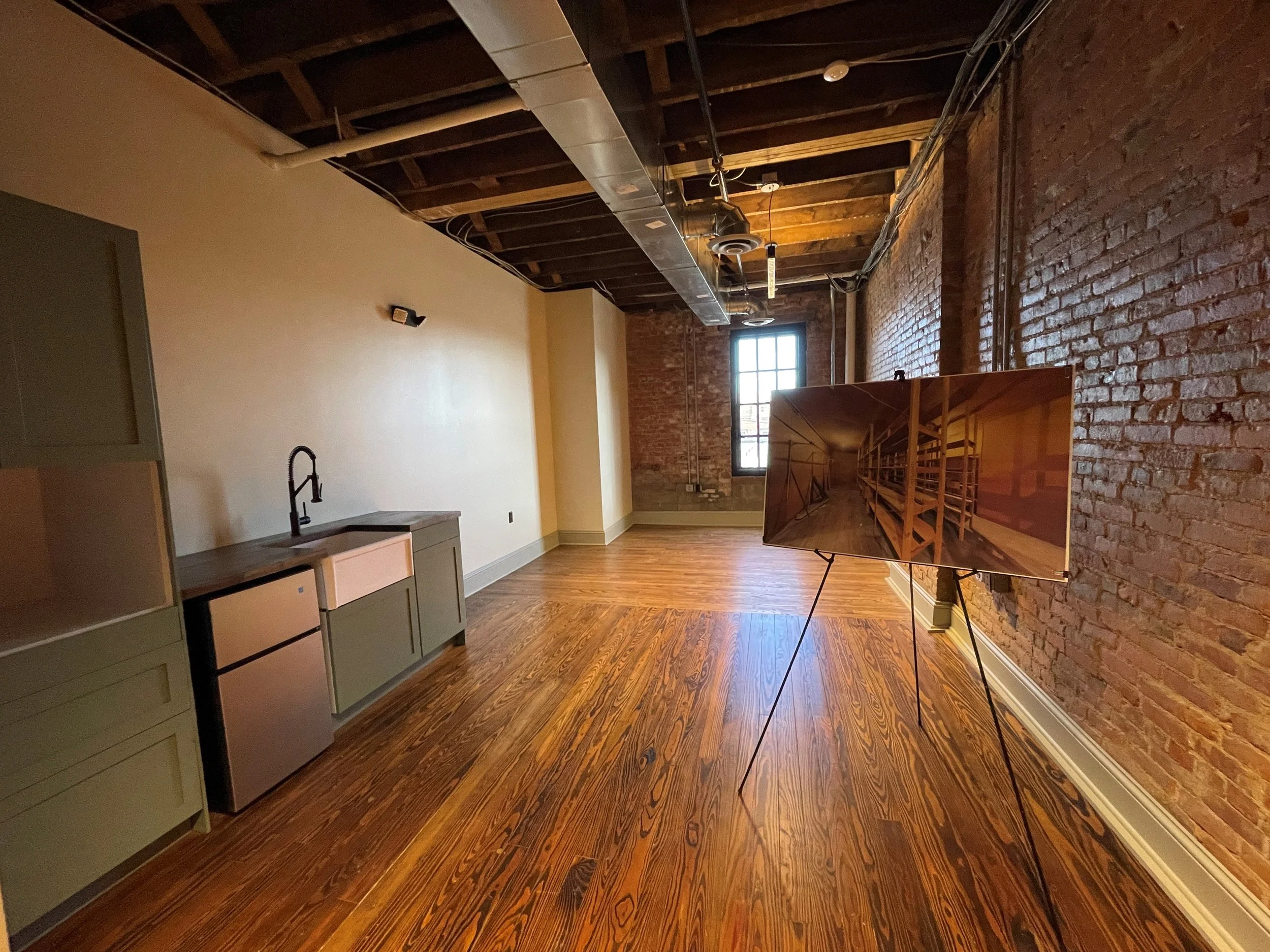 Exposed original brick walls, wood floors and 12’ high wood ceilings (with sound absorption)